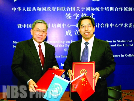 The ceremony on signing the Memorandum of Understanding on International Statistical Training and Cooperation Between Chinese Government and United Nations was held in Beijing on Jan. 12. Mr. Ma Jiantang, Commissioner of NBS, and Paul Cheung, Director of UNSD, respectively on behalf of Government of the People’s Republic of China and the United Nations, signed a memorandum of understanding on international statistical training and cooperation, and gave important addresses as well. Mr. Luo Lan, Member of Party Group and Discipline Inspection Group Leader of NBS, presided the ceremony.