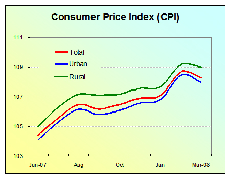 In March, consumer price index rose by 8.3 percent over the same period of the previous year. Of which, urban area and rural area was up by 8.0 percent and 9.0 percent respectively; the price of foodstuff, non-foodstuff, consumable and services expanded 21.4, 1.8, 10.4 and 1.8 percent respectively. Compared with February, CPI decreased 0.7 percent.