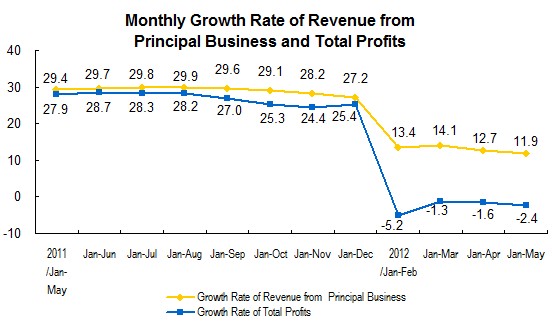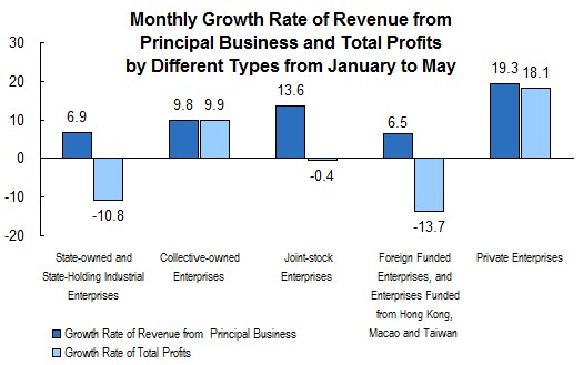 From January to May, the profits of state-owned and state-holding industrial enterprises above designated size gained 560.1 billion yuan, decreased 10.8 percent, that of collective-owned enterprises reached 29.1 billion yuan, increased 9.9 percent, that of joint-stock enterprises stood at 1,077.9 billion yuan, decreased 0.4 percent, that of foreign funded enterprises, and enterprises funded from Hong Kong, Macao and Taiwan achieved 427.2 billion yuan, decreased 13.7 percent, and that of private enterprises gained 550.0 billion yuan, increased 18.1 percent, year-on-year.