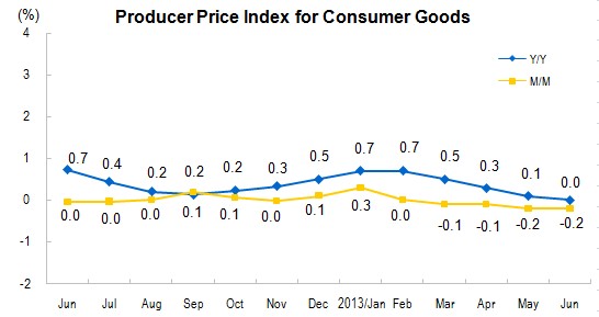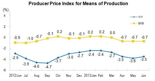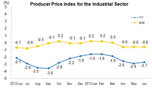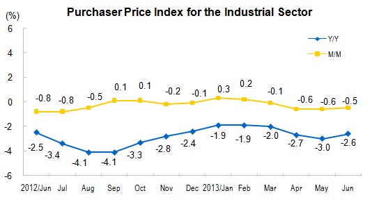 In June 2013, Producer Price Index (PPI) for manufactured goods decreased 2.7 percent year-on-year, and decreased 0.6 percent month-on-month. The purchasing price index for manufactured goods went down by 2.6 percent year-on-year, and 0.5 percent decrease month-on-month. In the first six months of 2013, the PPI decreased 2.2 percent, year-on-year, the purchasing price index for manufactured goods went down by 2.4 percent year-on-year.