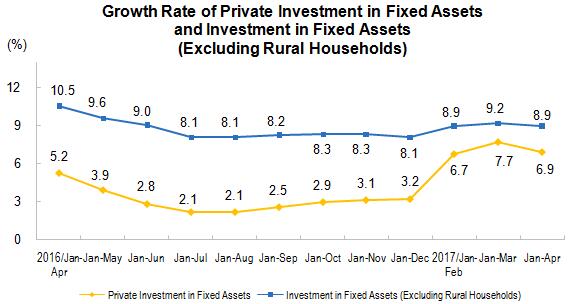 In the first four months of 2017, the private investment in fixed assets reached 8,805.3 billion yuan, a year-on-year increase of 6.9 percent in nominal terms, and the growth rate was 0.8 percentage points lower than that of the first three months. The proportion of private investment in fixed assets to the total investment in fixed assets (excluding rural households) was 61.0 percent.