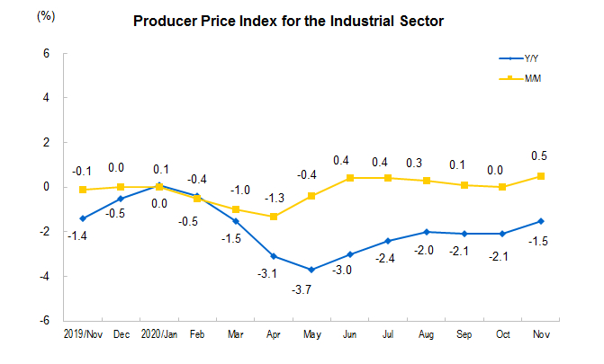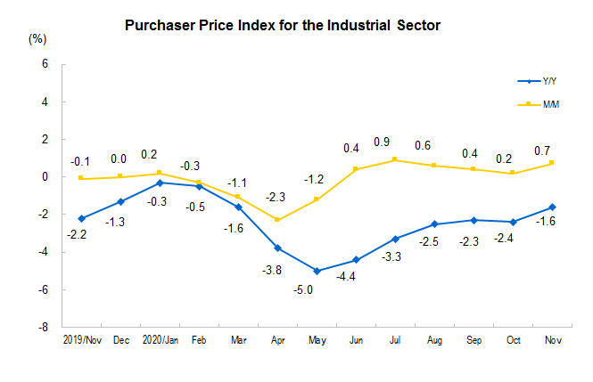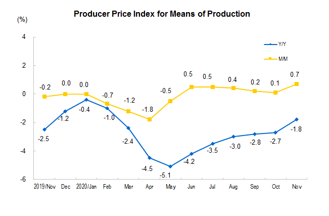 In November 2020, Producer Price Index (PPI) for manufactured goods dropped by 1.5 percent year-on-year and rose by 0.5 percent month-on-month. The purchasing price index for manufactured goods decreased by 1.6 percent year-on-year and increased by 0.7 percent month-on-month. From January to November, the producer price index for manufactured goods decreased by 2.0 percent year-on-year, and the purchasing price index for manufactured goods decreased by 2.5 percent.