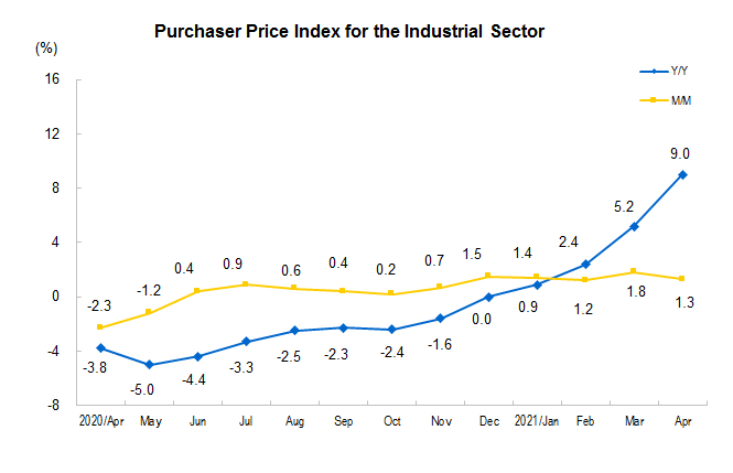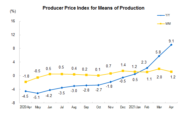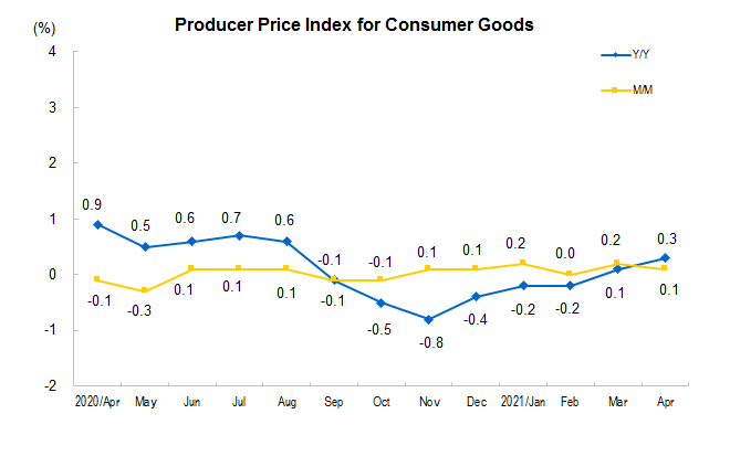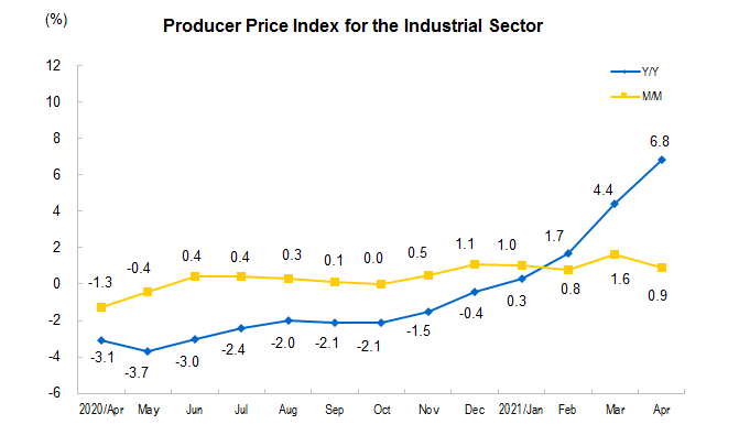 In April 2021, Producer Price Index (PPI) for manufactured goods rose by 6.8 percent year-on-year and 0.9 percent month-on-month. The purchasing price index for manufactured goods increased by 9.0 percent year-on-year and 1.3 percent month-on-month. From January to April, on average, the producer price of industrial products increased by 3.3 percent over the same period last year, and the purchasing price of industrial products increased by 4.3 percent.