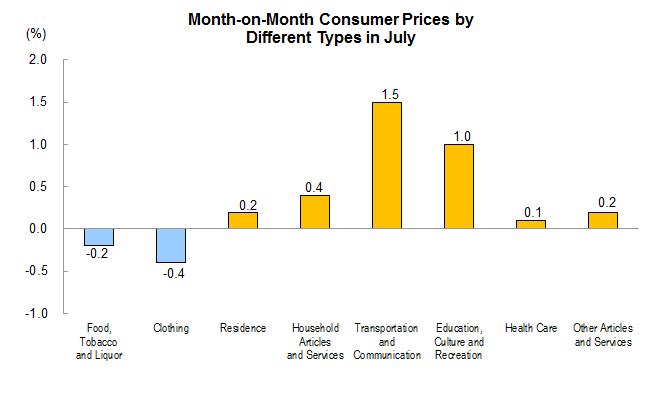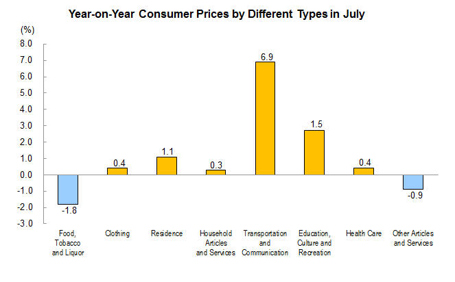 In July, the prices of food, tobacco and alcohol decreased by 1.8 percent year-on-year, affecting the CPI to decline by about 0.50 percentage point. Among foodstuff, the price of livestock meat decreased by 25.5 percent, affecting the CPI down by about 1.12 percentage points, of which the price of pork decreased by 43.5 percent, affecting the CPI down by about 1.05 percentage points; the price of fresh vegetables decreased by 4.0 percent, affecting the decline of CPI by about 0.08 percentage point; egg prices rose by 15.6 percent, affecting CPI up by about 0.09 percentage point; the price of aquatic products increased by 13.8 percent, which affected the increase of CPI by about 0.25 percentage point; fresh fruit prices rose by 5.2 percent, affecting CPI up by about 0.09 percentage point; grain prices rose by 0.7 percent, affecting CPI up by about 0.01 percentage point.