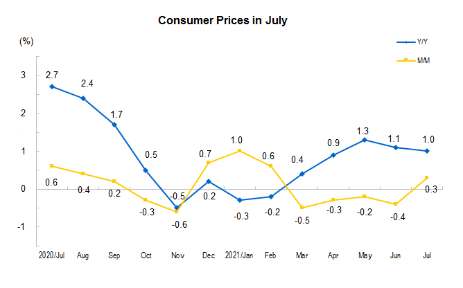 In July 2021, the national Consumer Price Index (CPI) rose by 1.0 percent year on year. Among them, the prices in urban and rural areas rose by 1.2 and 0.4 percent; the prices of food stuff fell by 3.7 percent, that of nonfood stuff rose by 2.1 percent; the prices of consumer goods and services rose by 0.6 and 1.6 percent. In the first seven months, China's consumer prices increased by 0.6 percent compared with the same period last year.