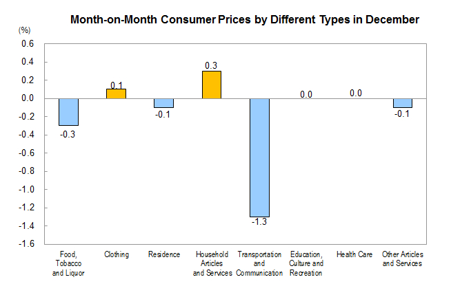 In December, the national consumer price fell by 0.3 percent month on month. Among them, the decline was 0.3 percent in urban areas and 0.3 percent in rural areas; food prices fell by 0.6 percent, and non-food prices fell by 0.2 percent; consumer goods prices fell by 0.4 percent and service prices were flat.