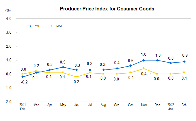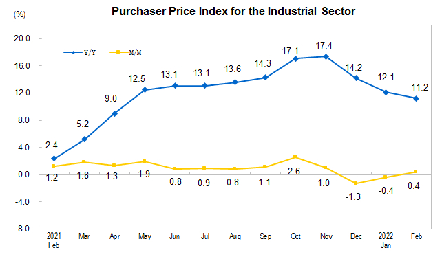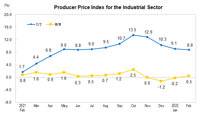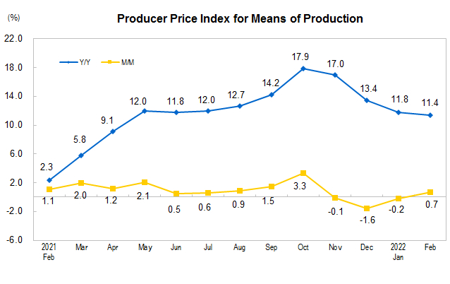 In February 2022, Producer Price Index (PPI) for manufactured goods rose by 8.8 percent year-on-year and 0.5 percent month on month; the purchase price of industrial producers increased by 11.2 percent year-on-year and 0.4 percent month on month. From January to February, on average, the producer price of industrial products increased by 8.9 percent over the same period last year, and the purchasing price of industrial products increased by 11.6 percent.