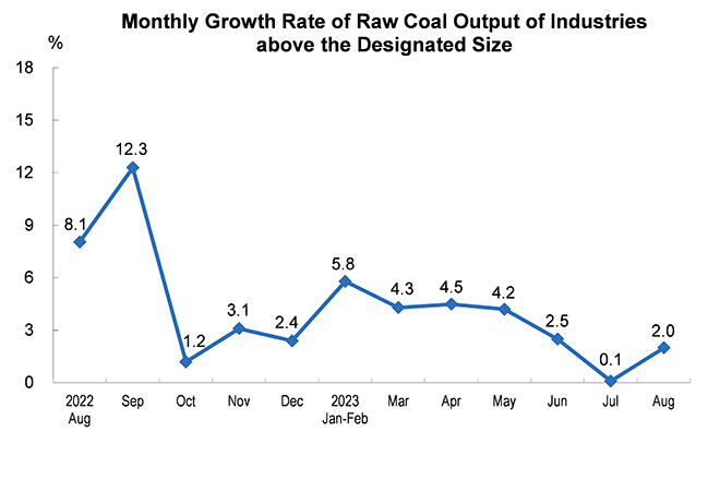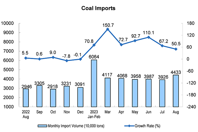 The growth rate of crude coal production increased slightly, and that of the import maintained rapid growth. In August, 380 million tons of raw coal were produced, up by 2.0 percent, a growth rate of 1.9 percentage points faster than that of the previous month, with an average daily output of 12.33 million tons. The import of coal was 44.33 million tons, up by 50.5 percent year on year, a growth rate of 16.7 percentage points slower than that of the previous month.
