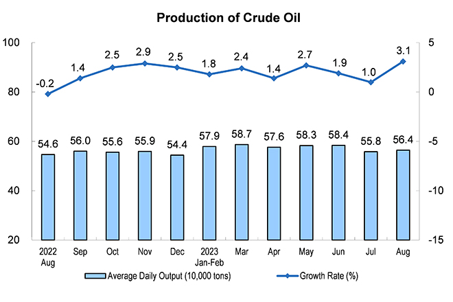The growth rate of the production and the import of crude oil both accelerated. In August, 17.47 million tons of crude oil were produced, up by 3.1 percent year on year, a growth rate of 2.1 percentage points faster than that of the previous month, with an average daily output of 564,000 tons. The import of crude oil was 52.80 million tons, up by 30.9 percent year on year, a growth rate of 13.8 percentage points faster than that of the previous month.