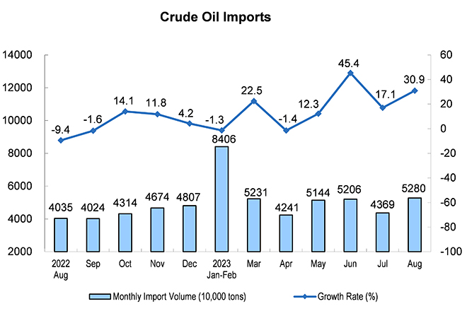 From January to August, 139.85 million tons of crude oil were produced, up by 2.1 percent year on year. The import of crude oil was 378.55 million tons, up by 14.7 percent year on year.