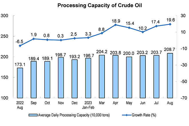 The growth rate of crude oil processing capacity continued to accelerate. In August, 64.69 million tons of crude oil were processed, up by 19.6 percent year on year, a growth rate of 2.2 percentage points faster than that of the previous month, with an average daily processing capacity of 2.087 million tons. From January to August, 491.40 million tons of crude oil were processed, up by 11.9 percent year on year.