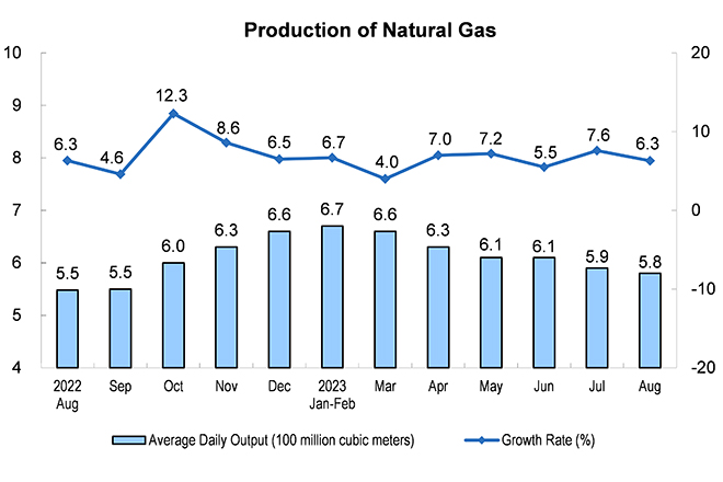 From January to August, 152.1 billion cubic meters of natural gas were produced, up by 5.7 percent year on year. The import of natural gas was 77.71 million tons, up by 9.4 percent year on year.