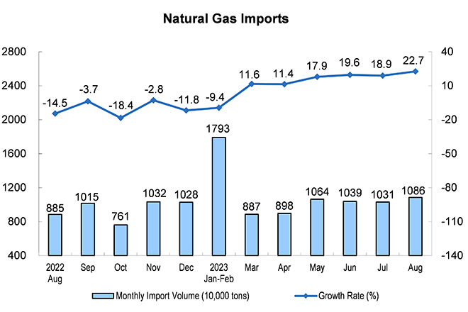 The growth rate of natural gas production increased steadily, and the import continued to grow rapidly. In August, 18.1 billion cubic meters of natural gas were produced, up by 6.3 percent year on year, a growth rate of 1.3 percentage points slower than that of the previous month, with an average daily output of 580 million cubic meters. The import of natural gas was 10.86 million tons, up by 22.7 percent year on year, a growth rate of 3.8 percentage points faster than that of the previous month.