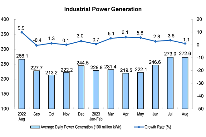 The power generation enjoys steady growth. In August, the power generation was 845.0 billion kWh, up by 1.1 percent year on year, a growth rate of 2.5 percentage points slower than that of the previous month, with an average daily power generation of 27.26 billion kWh. From January to August, the power generation was 5.8663 trillion kWh, up by 3.6 percent year on year.