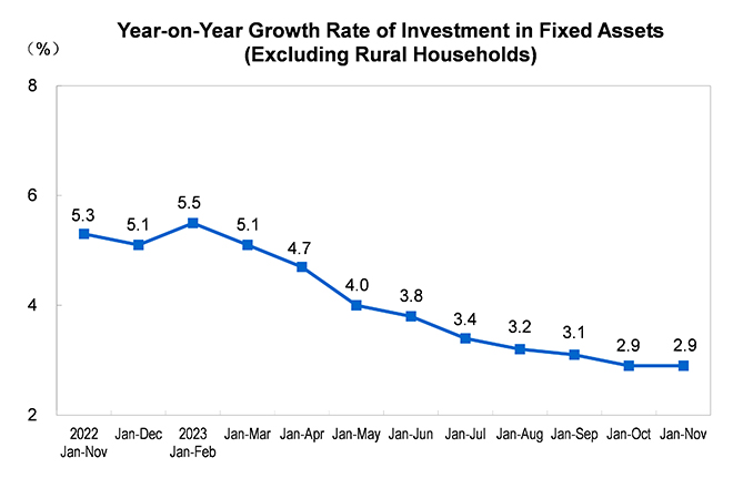 From January to November, the investment in fixed assets (excluding rural households) was 46,081.4 billion yuan, a year-on-year increase of 2.9 percent (calculated on a comparable basis, see Annotation 7 for details), of which the investment in manufacturing increased by 6.3 percent, a growth rate of 0.1 percentage point faster than that from January to October. On a month-on-month basis, the investment in fixed assets (excluding rural households) increased by 0.26 percent in November. From January to November, the private investment in fixed assets was 23,526.7 billion yuan, a decrease of 0.5 percent over the previous year.