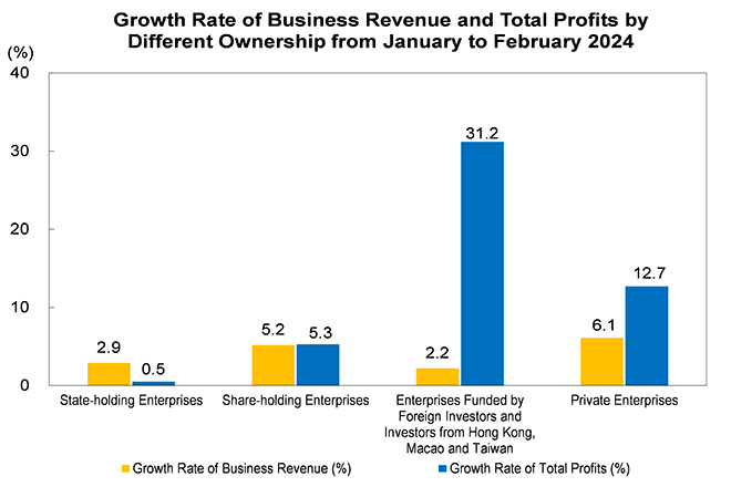 From January to February, among industrial enterprises above designated size, state-holding enterprises realized a total profit of 343.49 billion yuan, a year-on-year increase of 0.5 percent; share-holding enterprises realized a total profit of 689.85 billion yuan, an increase of 5.3 percent; enterprises funded by foreign investors and investors from Hong Kong, Macao and Taiwan realized a total profit of 216.92 billion yuan, an increase of 31.2 percent; private enterprises realized a total profit of 246.54 billion yuan, an increase of 12.7 percent.