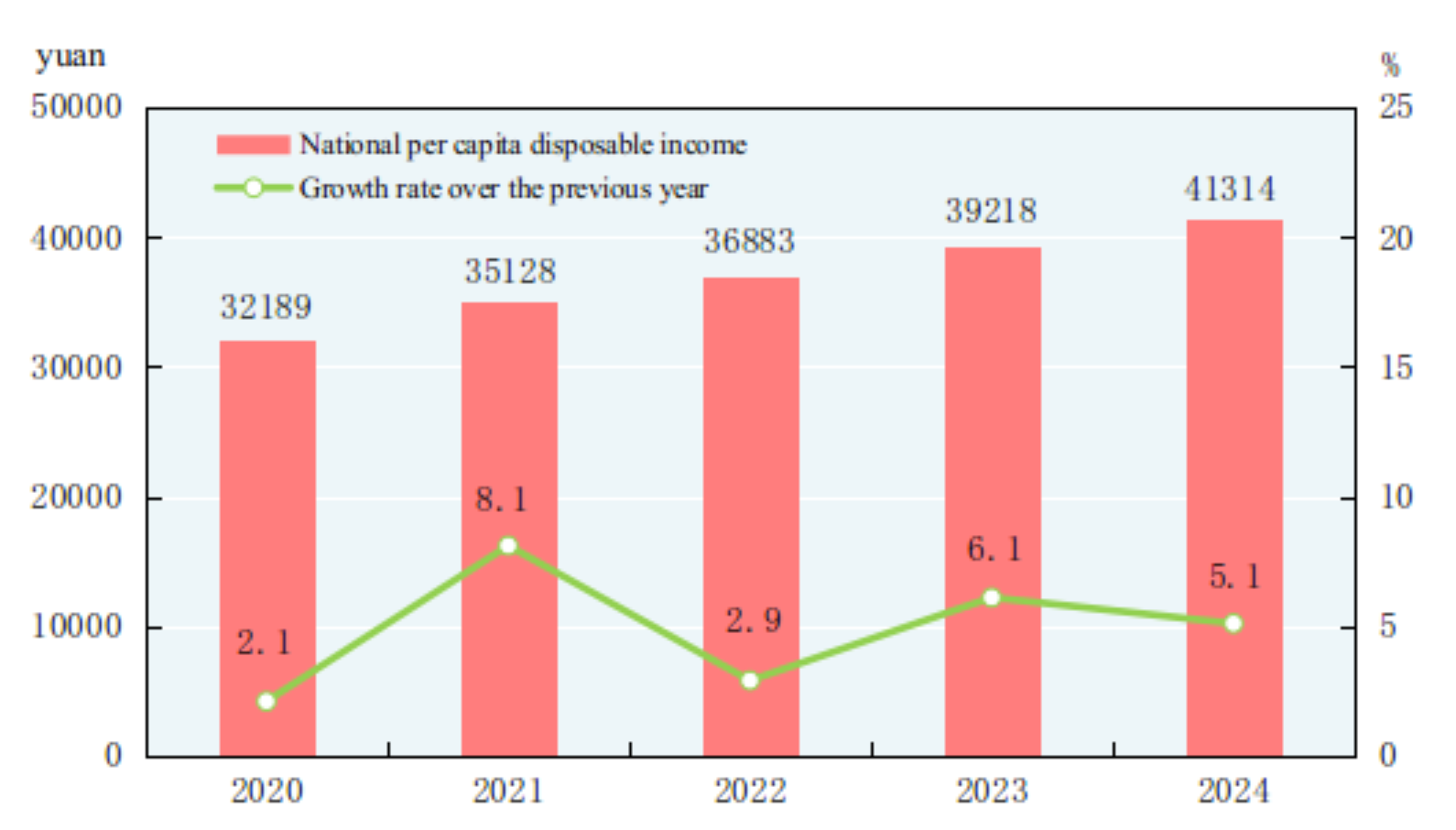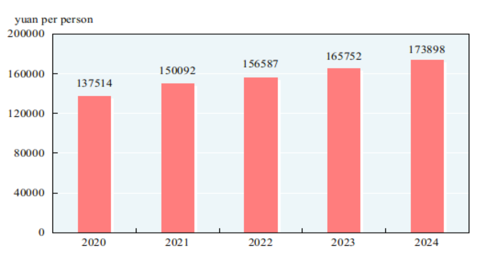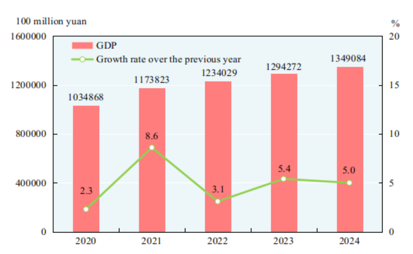 According to preliminary estimates, the gross domestic product (GDP)[2] in 2024 was 134,908.4 billion yuan, up by 5.0 percent over the previous year. Of this total, the value added of the primary industry was 9,141.4 billion yuan, up by 3.5 percent over the previous year, that of the secondary industry was 49,208.7 billion yuan, up by 5.3 percent, and that of the tertiary industry was 76,558.3 billion yuan, up by 5.0 percent. The value added of the primary industry accounted for 6.8 percent of the GDP; that of the secondary industry accounted for 36.5 percent; and that of the tertiary industry accounted for 56.7 percent. The contribution of the final consumption expenditure to GDP growth rate was up by 2.2 percentage points, that of the gross capital formation to GDP growth rate up by 1.3 percentage points and that of the net exports of goods and services to GDP growth rate up by 1.5 percentage points. By quarter, the GDP went up by 5.3 percent year on year for the first quarter, up by 4.7 percent for the second quarter, 4.6 percent for the third quarter and 5.4 percent for the fourth quarter. The per capita GDP in 2024 was 95,749 yuan, up by 5.1 percent over the previous year. The gross national income[3] in 2024 was 133,967.2 billion yuan, up by 5.1 percent over the previous year. The overall labor productivity[4] was 173,898 yuan per person, up by 4.9 percent over the previous year.