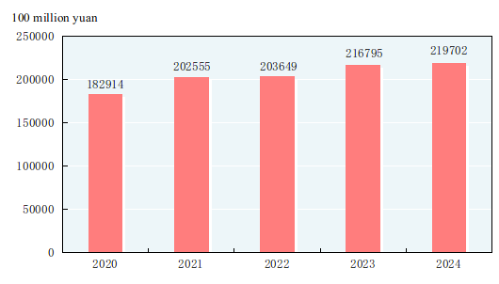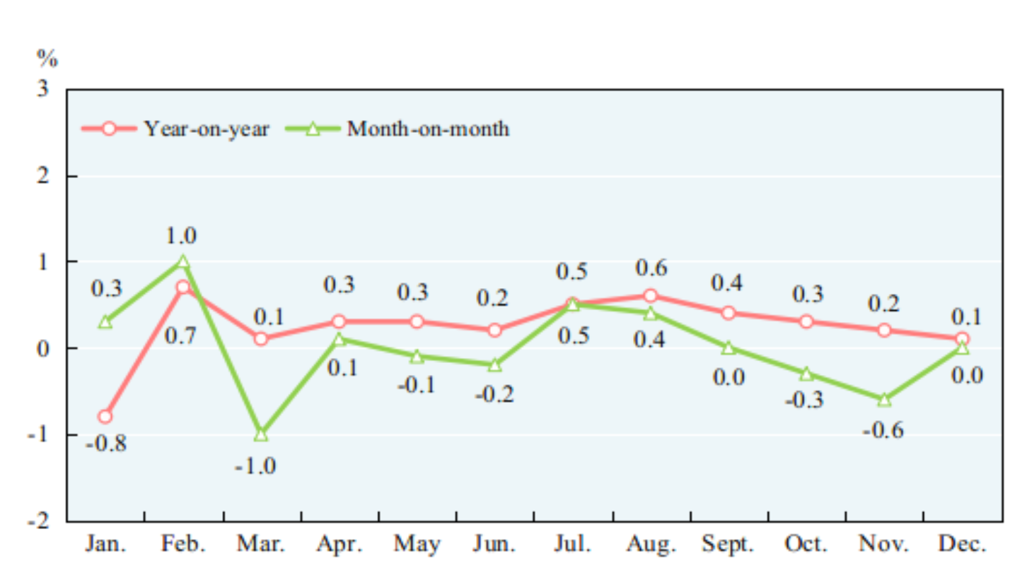 The consumer prices in 2024 went up by 0.2 percent over the previous year. The producer prices for industrial products went down by 2.2 percent and the purchasing prices for industrial producers down by 2.2 percent. The producer prices for farm products[9] dropped by 0.9 percent. In December, out of the 70 large and medium-sized cities, 23 cities experienced a month-on-month rise in sales prices of newly-built commercial residential buildings, 4 cities maintained the same level and 43 cities experienced a decline; 9 cities experienced a month-on-month rise in sales prices of second-hand housing, 1 city maintained the same level and 60 cities experienced a decline. Two cities experienced a year-on-year rise in sales prices of newly-built commercial residential buildings, and 68 cities experienced a decline. The number of cities experiencing a year-on-year decline in sales prices of second-hand housing was 70.