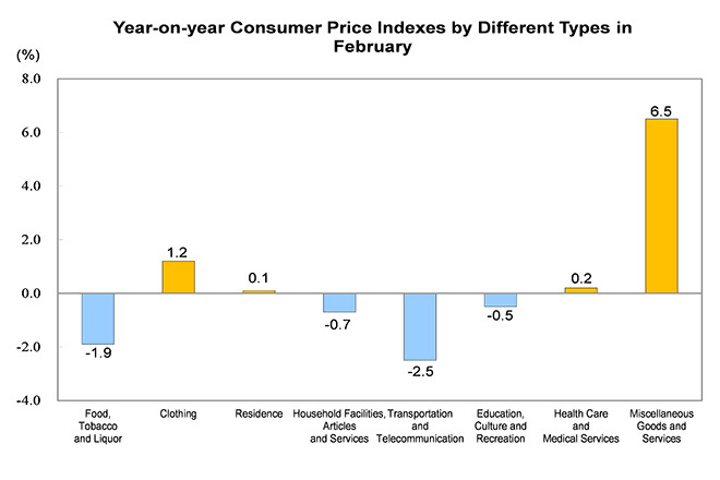 In February, the national CPI decreased by 0.2 percent month on month. Among them, the price in urban areas decreased by 0.2 percent and the price in rural areas decreased by 0.1 percent; the price for food decreased by 0.5 percent and for nonfood decreased by 0.1 percent; prices for consumer goods were flat and for services decreased by 0.5 percent.