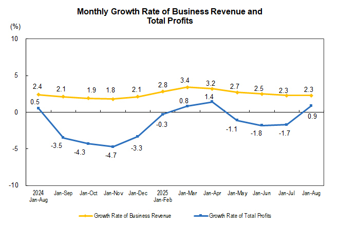 From January to August, the total profits of industrial enterprises above the designated size nationwide reached 4,692.97 billion yuan, a year-on-year increase of 0.9 percent (calculated on a comparable basis, see Annotation 2 for details).
