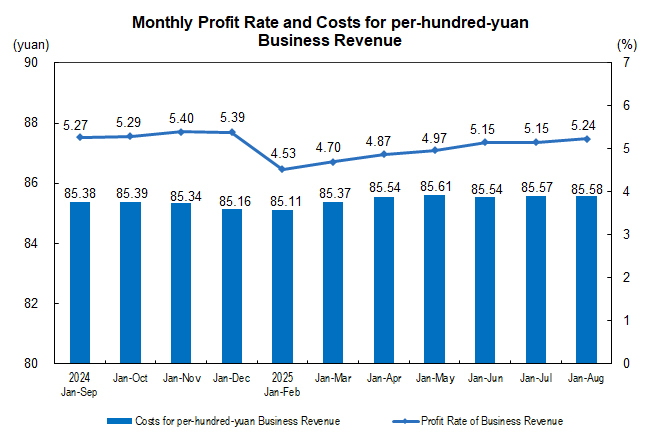 From January to August, the costs of industrial enterprises above the designated size for per-hundred-yuan business revenue were 85.58 yuan, a year-on-year increase of 0.19 yuan; the expenses for per-hundred-yuan business revenue were 8.37 yuan, a year-on-year decrease of 0.08 yuan.