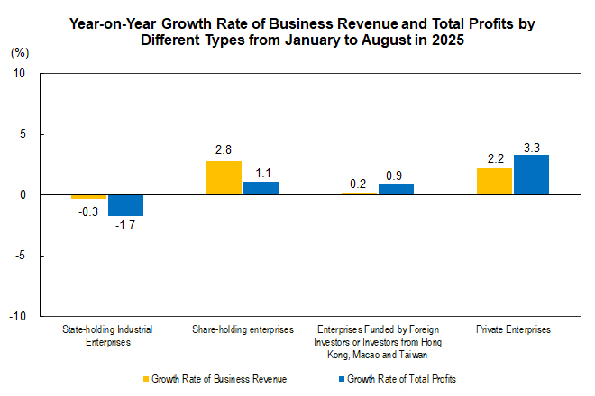 From January to August, among industrial enterprises above the designated size, state-holding enterprises realized a total profit of 1,515.65 billion yuan, a year-on-year decrease of 1.7 percent; share-holding enterprises realized a total profit of 3,493.19 billion yuan, an increase of 1.1 percent; enterprises funded by foreign investors or investors from Hong Kong, Macao and Taiwan realized a total profit of 1,172.36 billion yuan, an increase of 0.9 percent; and private enterprises realized a total profit of 1,307.61 billion yuan, an increase of 3.3 percent.