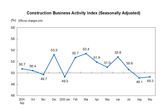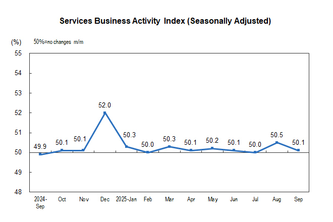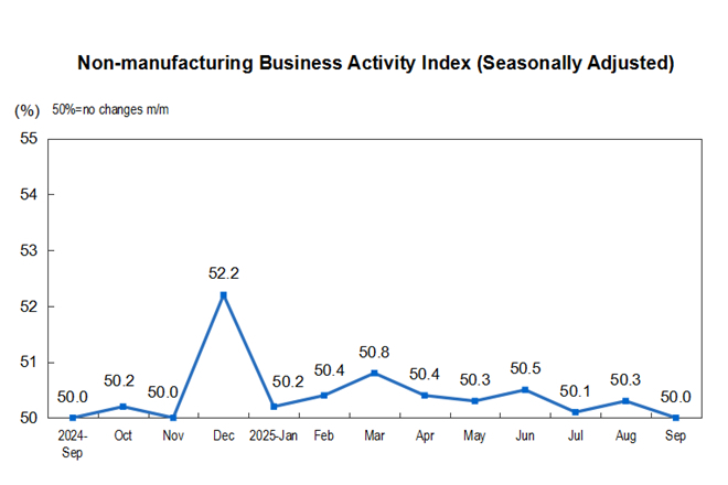 In September, the non-manufacturing business activity index was 50.0 percent, a decrease of 0.3 percentage points from the previous month, standing at the threshold, which indicated general stability in non-manufacturing business activity.