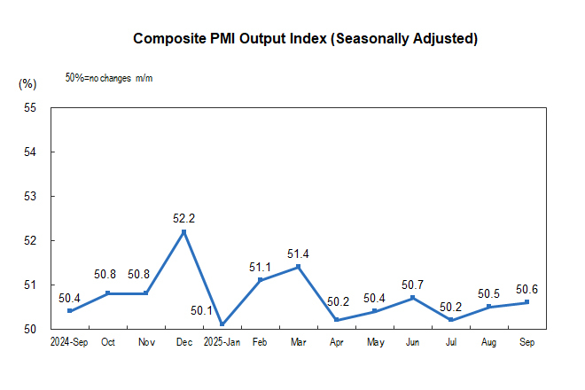 In September, the composite PMI output index was 50.6 percent, an increase of 0.1 percentage points from the previous month, still above the threshold, indicating that the overall expansion in production and operation of Chinese enterprises further accelerated.