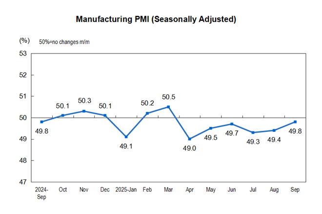 In September, the purchasing managers’ index (PMI) of China’s manufacturing industry came in at 49.8 percent, an increase of 0.4 percentage points from the previous month. The manufacturing business climate continued to improve.