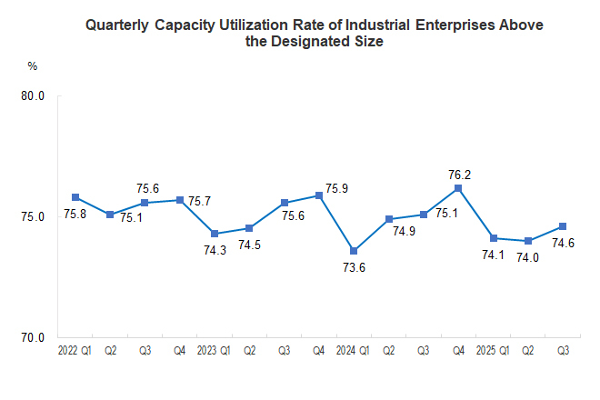 In the third quarter of 2025, the industrial capacity utilization rate of industrial enterprises above the designated size nationwide was 74.6%, up by 0.6 percentage points from the second quarter and down by 0.5 percentage points from the same period last year.