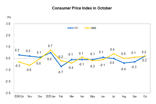 In October 2025, China’s Consumer Price Index (CPI) increased by 0.2% year on year. Specifically, the price index in urban areas increased by 0.3% while that in rural areas decreased by 0.2%; the price index for food decreased by 2.9% while that for non-food increased by 0.9%; the price index for consumer goods decreased by 0.2% while that for services increased by 0.8%. From January to October, on average, China’s CPI decreased by 0.1% compared with the same period of the previous year.