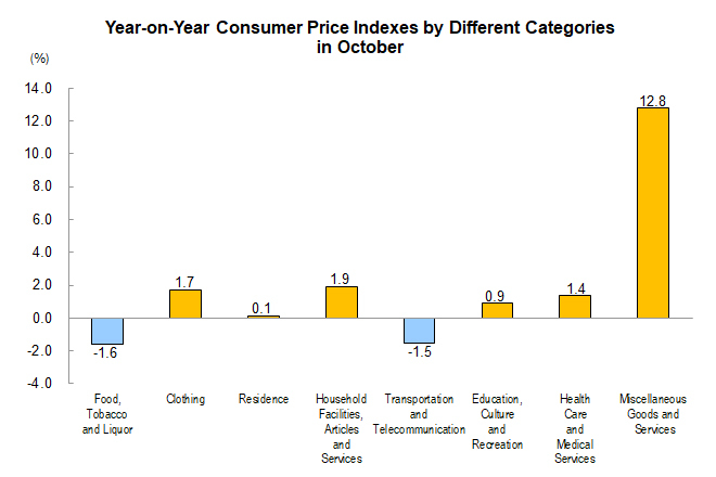 Among price indexes for the other seven major categories, six increased and one decreased year on year. Specifically, the price indexes for miscellaneous goods and services, household facilities, articles and services, and clothing increased by 12.8%, 1.9%, and 1.7%, respectively; the price indexes for health care and medical services, education, culture and recreation, and residence increased by 1.4%, 0.9%, and 0.1%, respectively; and that for transportation and telecommunication decreased by 1.5%.