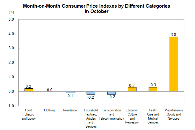 In October, the price index for food, tobacco and liquor increased by 0.2% month on month, pushing the CPI up by about 0.07 percentage points. Among food, the price index for fresh vegetables increased by 4.3%, pushing the CPI up by about 0.09 percentage points; that for fresh fruits increased by 1.2%, pushing the CPI up by about 0.03 percentage points; that for eggs decreased by 1.7%, pushing the CPI down by about 0.01 percentage points; that for meat of livestock decreased by 0.9%, pushing the CPI down by about 0.03 percentage points, of which the price index for pork decreased by 2.5%, pushing the CPI down by about 0.03 percentage points; that for aquatic products decreased by 0.9%, pushing the CPI down by about 0.02 percentage points.