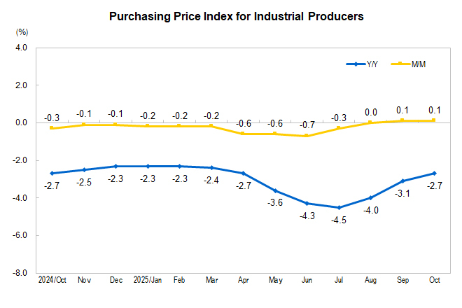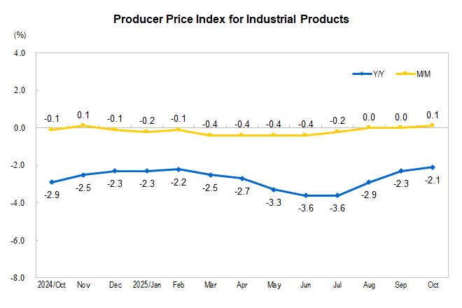 In October 2025, China’s Producer Price Index (PPI) for industrial products decreased by 2.1% year on year, with the decline narrowing by 0.2 percentage points from the previous month; on a month-on-month basis, it turned from being flat in the previous month to an increase of 0.1%. The purchasing price index for industrial producers decreased by 2.7% year on year, with the decline narrowing by 0.4 percentage points from the previous month, and increased by 0.1% month on month, with the same increase as the previous month. From January to October, on average, the producer price index for industrial products decreased by 2.7% year on year, while the purchasing price index for industrial producers dropped by 3.2%.