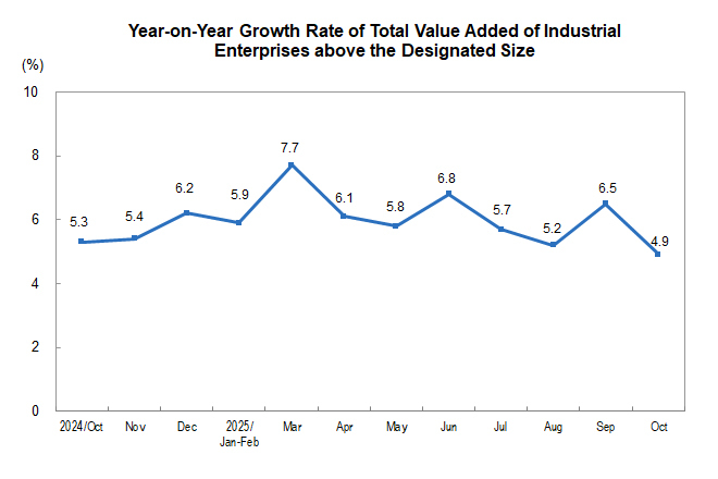 According to the results of automatic correction of the seasonal adjustment model, the month-on-month growth rates of the total value added of the industrial enterprises above the designated size from October 2024 to September 2025 have been revised. The revised results and month-on-month data for October 2025 are as follows: