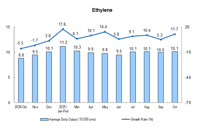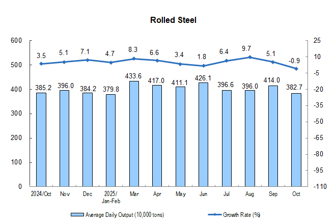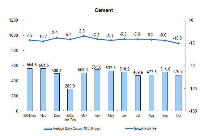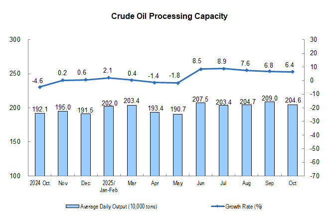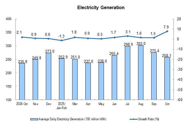 In terms of products, in October, the output of 313 out of 623 products produced by industrial enterprises above the designated size increased year on year. Among them, the output of rolled steel was 118.64 million tons, down by 0.9% year on year; that of cement was 147.75 million tons, down by 15.8%; that of ten kinds of non-ferrous metals was 6.95 million tons, up by 2.9%; that of ethylene was 3.14 million tons, up by 11.7%; that of motor vehicles was 3.279 million sets, up by 11.2%, including 1.710 million new energy vehicles, up by 19.3%; the electricity generation was 800.2 billion kWh, up by 7.9%; and the crude oil processing capacity was 63.43 million tons, up by 6.4%.