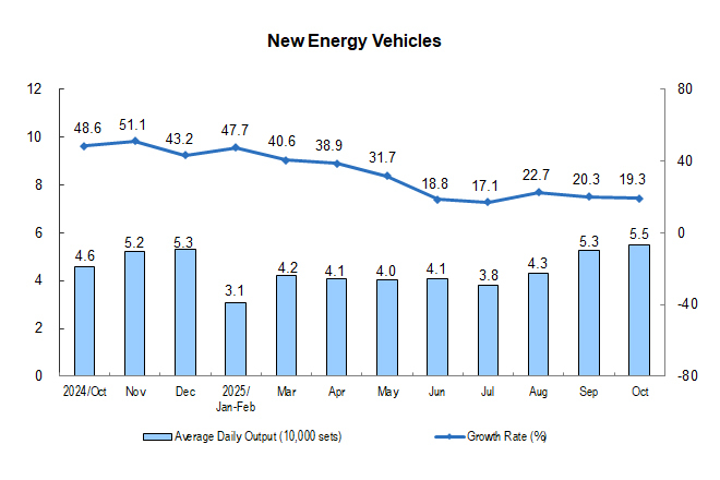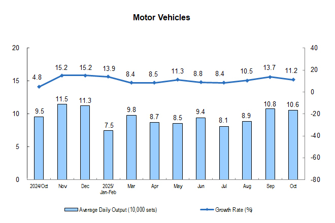 In terms of industries, in October, the value added of 29 of the 41 major industries continued to show year-on-year growth. Among them, the value added of the mining and washing of coal went up by 6.5%, that of the extraction of petroleum and natural gas up by 1.9%, that of the processing of food from agricultural and sideline products up by 2.5%, that of the manufacture of liquor, beverages and refined tea down by 1.9%, that of the textile industry up by 0.2%, that of the manufacture of raw chemical materials and chemical products up by 7.1%, that of the manufacture of non-metallic mineral products down by 3.2%, that of the smelting and pressing of ferrous metals up by 1.4%, that of the smelting and pressing of non-ferrous metals up by 3.7%, that of the manufacture of general-purpose machinery up by 6.9%, that of the manufacture of special-purpose machinery up by 0.7%, that of the manufacture of motor vehicles up by 16.8%, that of the manufacture of railway, ship, aerospace and other transport equipment up by 15.2%, that of the manufacture of electrical machinery and apparatus up by 4.9%, that of the manufacture of computers, communication equipment and other electronic equipment up by 8.9%, and that of the production and supply of electricity and thermal power up by 5.9%.