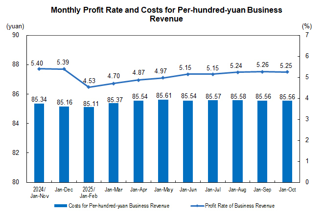 From January to October, the costs for per-hundred-yuan business revenue of industrial enterprises above the designated size were 85.56 yuan, a year-on-year increase of 0.17 yuan; the expenses for per-hundred-yuan business revenue were 8.37 yuan, a year-on-year decrease of 0.10 yuan.