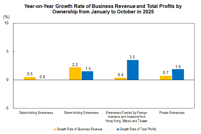 From January to October, among industrial enterprises above the designated size, state-holding enterprises realized a total profit of 1,849.02 billion yuan, remaining flat year on year; share-holding enterprises realized a total profit of 4,432.83 billion yuan, an increase of 1.5%; enterprises funded by foreign investors and investors from Hong Kong, Macao and Taiwan realized a total profit of 1,484.86 billion yuan, an increase of 3.5%; private enterprises realized a total profit of 1,699.56 billion yuan, an increase of 1.9%.