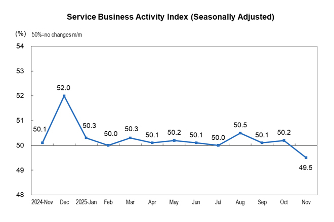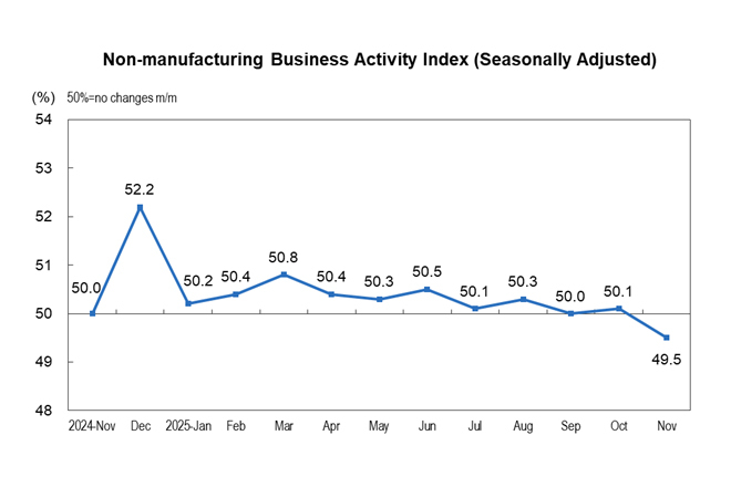In November, the non-manufacturing business activity index was 49.5%, a decrease of 0.6 percentage points from the previous month.