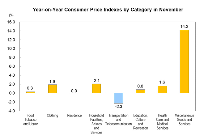 In November, the price index for food, tobacco and liquor increased by 0.3% year on year, pushing the CPI up by about 0.09 percentage points. Among food, the price index for fresh vegetables increased by 14.5%, pushing the CPI up by about 0.31 percentage points; that for aquatic products increased by 1.5%, pushing the CPI up by about 0.03 percentage points; that for fresh fruits increased by 0.7%, pushing the CPI up by about 0.01 percentage points; that for eggs decreased by 12.5%, pushing the CPI down by about 0.08 percentage points; that for meat of livestock decreased by 6.6%, pushing the CPI down by about 0.20 percentage points, of which the price index for pork decreased by 15.0%, pushing the CPI down by about 0.21 percentage points; that for grain decreased by 0.4%, pushing the CPI down by about 0.01 percentage points.