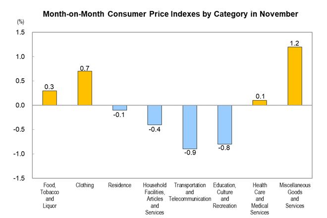 In November, China’s CPI decreased by 0.1% month on month. Specifically, the price index for urban areas decreased by 0.1%, while that for rural areas remained flat; the price index for food increased by 0.5%, while that for non-food decreased by 0.2%; the price index for consumer goods increased by 0.1%, while that for services decreased by 0.4%.