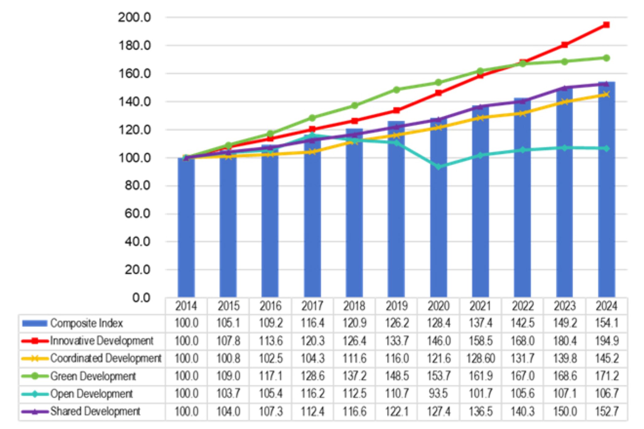 In 2024, Beijing, Tianjin, and Hebei thoroughly implemented the guiding principles of General Secretary Xi Jinping’s important speeches on Beijing-Tianjin-Hebei (“BTH”) Coordinated Development, adhered to the general principle of pursuing progress while ensuring stability, solidly promoted innovative coordination and industrial cooperation, and constantly deepened coordinated development. The calculation results showed that the BTH Coordinated Development Index was 154.1 (with 2014 as the baseline), an increase of 4.9 compared with 2023. Among them, the two sub-indices of innovative development (194.9) and green development (171.2) were higher than the composite index, increasing by 14.5 and 2.6, respectively, compared with 2023, acting as the key drivers of the overall increase; the shared development index and coordinated development index steadily rose, standing at 152.7 and 145.2, up 2.7 and 5.4 from 2023, respectively; the open development index moderated, with a value of 106.7, down 0.4 from 2023.