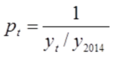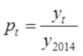 To ensure the additivity of indicators at each level, each indicator value is standardized first. The 2014 value of the indicator is taken as the baseline 1, and each indicator is standardized according to the differences between positive and negative indicators. The processing method is as follows: yt is the calculated value of an indicator, y2014 is the calculated value of an indicator in 2014, and pt is the standardized indicator value. Where, t = 2014, ..., 2024.
