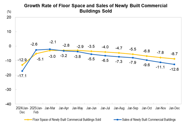 At the end of 2025, the floor space of commercial buildings for sale was 766.32 million square meters, up 1.6% from the end of the previous year, 1.0 percentage point lower than that at the end of November. Specifically, the floor space of residential buildings for sale increased by 2.8%.