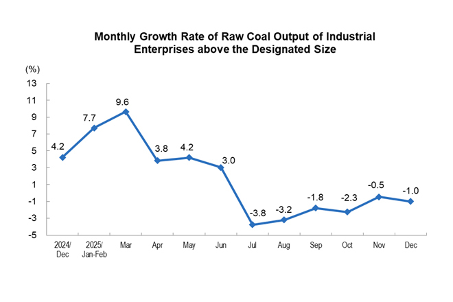From January to December, the raw coal production by industrial enterprises above the designated size was 4.83 billion tons, a year-on-year increase of 1.2%.