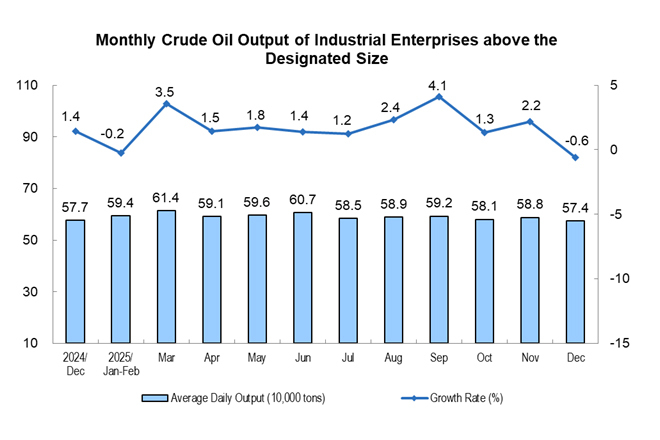 From January to December, the crude oil production by industrial enterprises above the designated size was 216.05 million tons, a year-on-year increase of 1.5%.