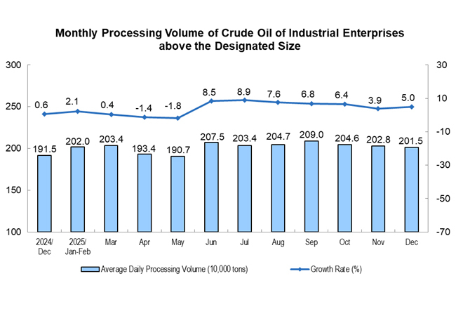 From January to December, the crude oil processing volume of industrial enterprises above the designated size was 737.59 million tons, a year-on-year increase of 4.1%.