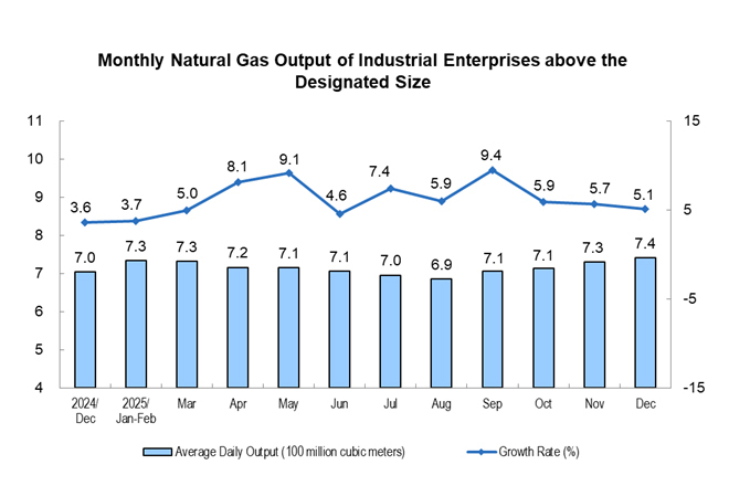 The growth of natural gas production remained stable. In December, the production of natural gas by industrial enterprises above the designated size was 23.0 billion cubic meters, a year-on-year increase of 5.1%; the average daily output was 740 million cubic meters.