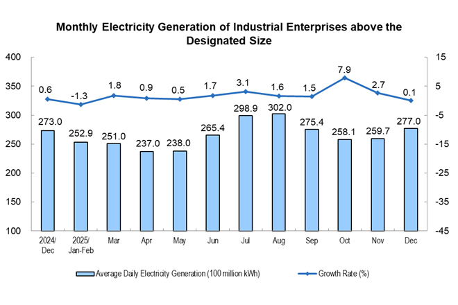 The electricity generation by industrial enterprises above the designated size maintained its growth. In December, electricity generation by industrial enterprises above the designated size was 858.6 billion kWh, a year-on-year increase of 0.1%; the average daily electricity generation was 27.70 billion kWh. From January to December, the electricity generation by industrial enterprises above the designated size was 9,715.9 billion kWh, a year-on-year increase of 2.2%.